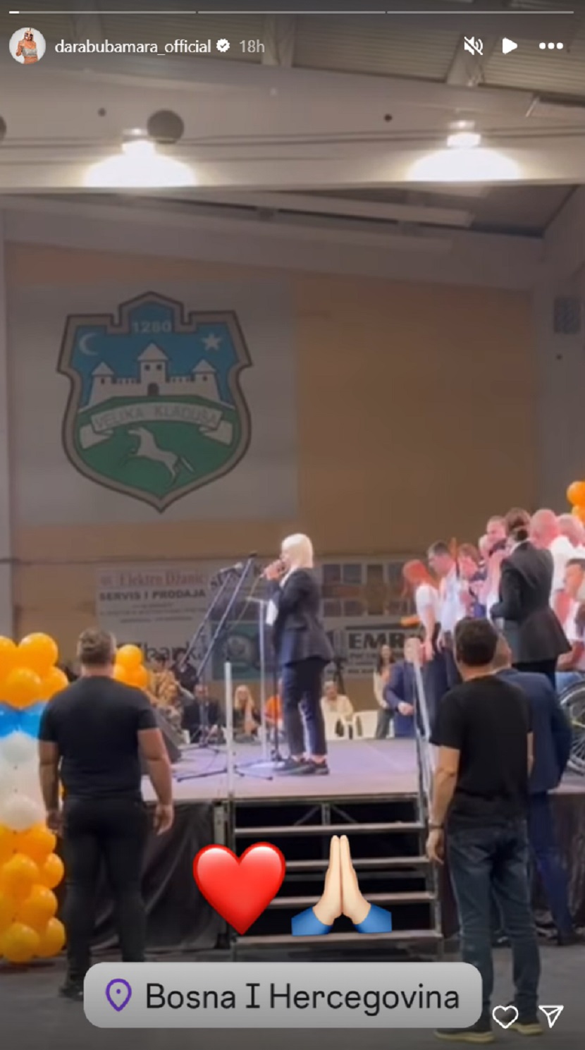 “Htjela bih da vas pozdravim i da se zahvalim organizatorima što su me pozvali večeras da nastupim i sa svojim orkestrom održim koncert. Međutim, svi znamo šta se noćas desilo u Bosni i Hercegovini – tragičan događaj koji je za mene nešto strašno i ja mislim onako, kao jedan čovek koji ima duše i ljudskosti, jednostavno neću moći da nastupim večeras”, poručila je Dara te izjavila saučešće porodicama preminulih.