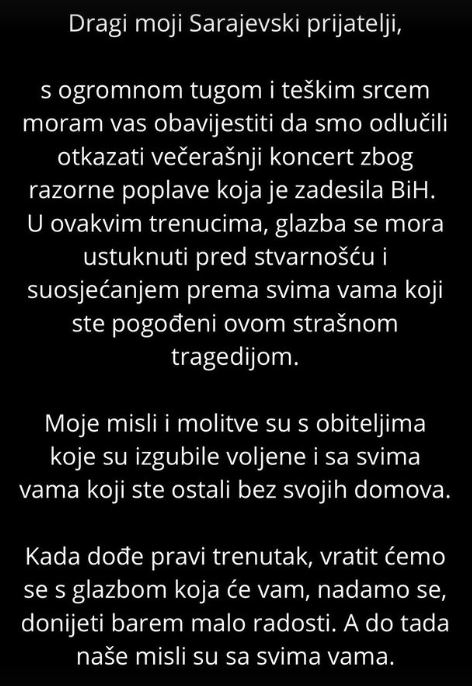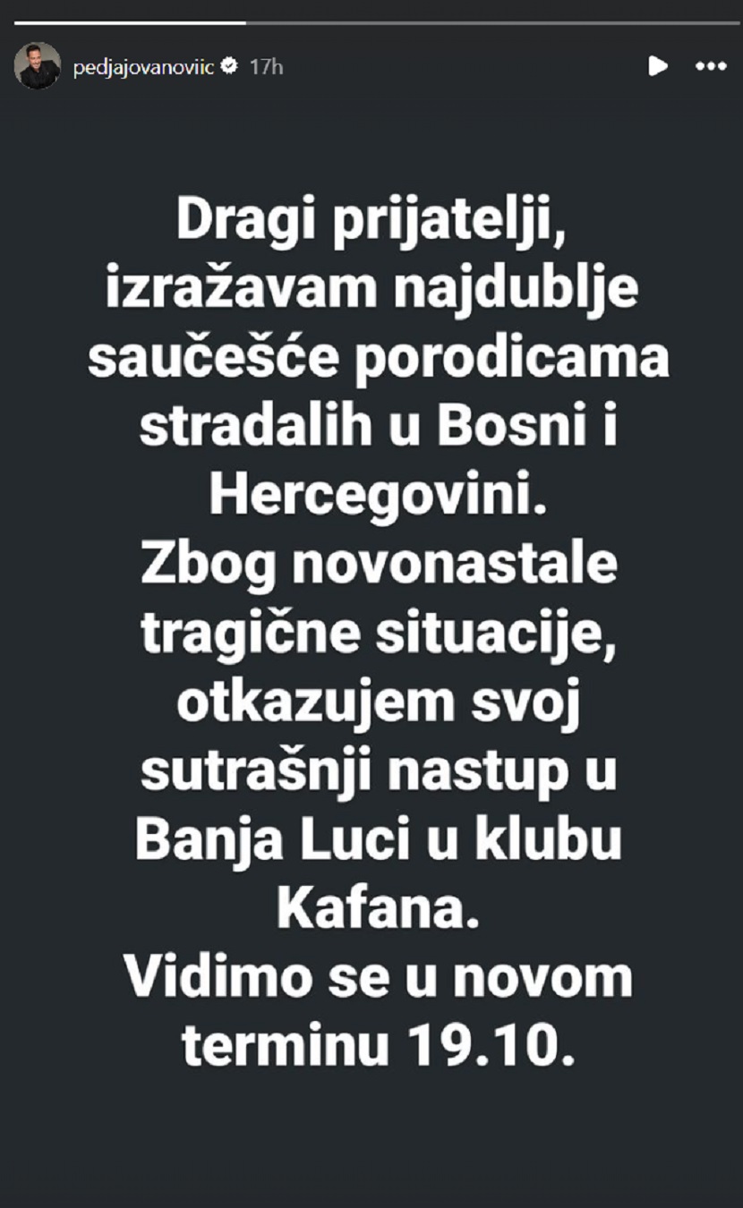 “Dragi prijatelji, izražavam najdublje saučešće porodicama stradalih u Bosni i Hercegovini. Zbog novonastale tragične situacije, otkazujom svoj sutrašnji nastup. Vidimo se u novom terminu 19.10.”, stoji u njegovom saopštenju.