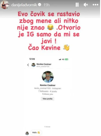 “Evo, čovjek se razveo zbog mene, ali niko nije znao. Otvorio je Instagram samo da mi se javi. Ćao Kevine”, napisala je Danijela uz fotku.