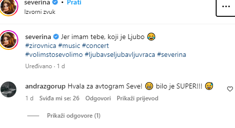 Usput, dobila je i buket, a saznala je da se momak zove Andraž, te da mu je grupa drugara servirala iznenađenje u vidu momačke večeri na koncertu. Seve je ovaj simpatični trenutak podijelila na svom Instagram profilu.