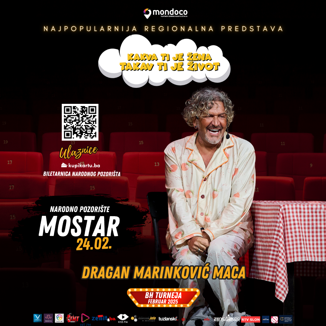 Večeras u 19 sati na Veliku scenu Narodnog pozorišta u Mostaru Dragan Marinković Maca stiže sa svojom hit komedijom „Kakva ti je žena, takav ti je život“, a sve ulaznice su već rasprodate!