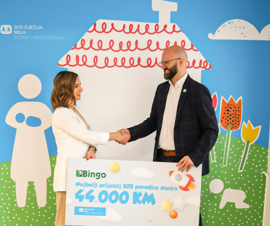 Kompanija Bingo i organizacija SOS Dječija sela u BiH danas su svečano ozvaničili nastavak dugogodišnjeg partnerstva uručenjem donatorskog čeka u iznosu od 44.000 KM, kojim Bingo i ove godine pokriva godišnje troškove života porodice SOS mame Amire.